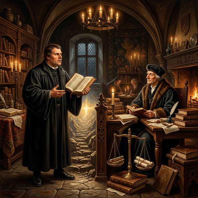 伊拉斯谟出版《论自由意志》(1524),主张神人合作救恩。路德以《意志的束缚》(1525)回击,断言人的意志被罪奴役,救恩完全取决于上帝主权的恩典。