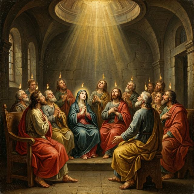 The Holy Spirit descends upon the apostles in Jerusalem, empowering them to preach the Gospel in multiple languages. This event marks the birth of the Christian Church and fulfills Jesus' promise to send the Advocate.